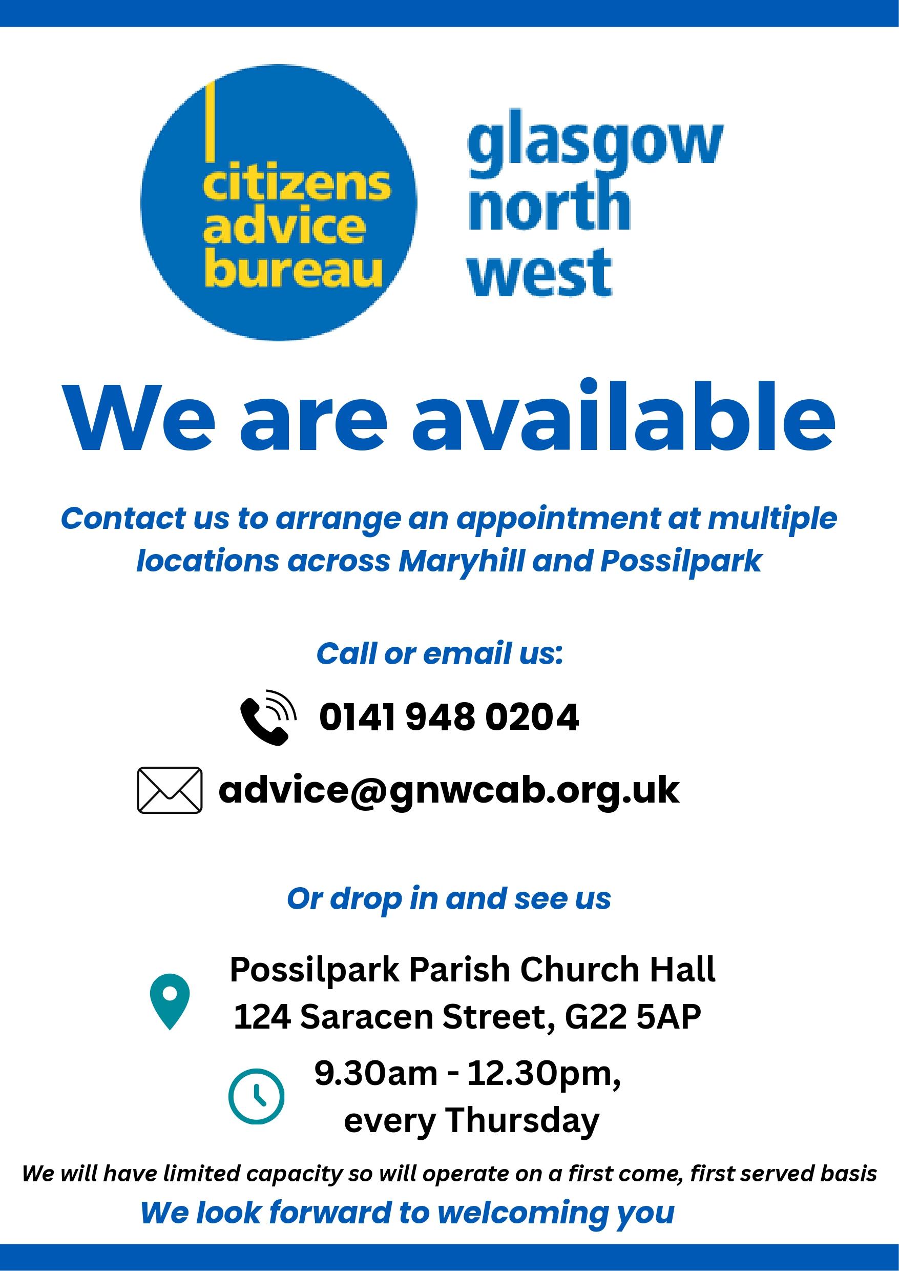Glasgow North West Citizens Advice Bureau are hosting drop-in sessions Thursdays between 9:30am - 12:30pm at Possilpark Parish Church Hall. Support is also available by appointment - call 0141 948 0204 or email advice@gnwcab.org.uk