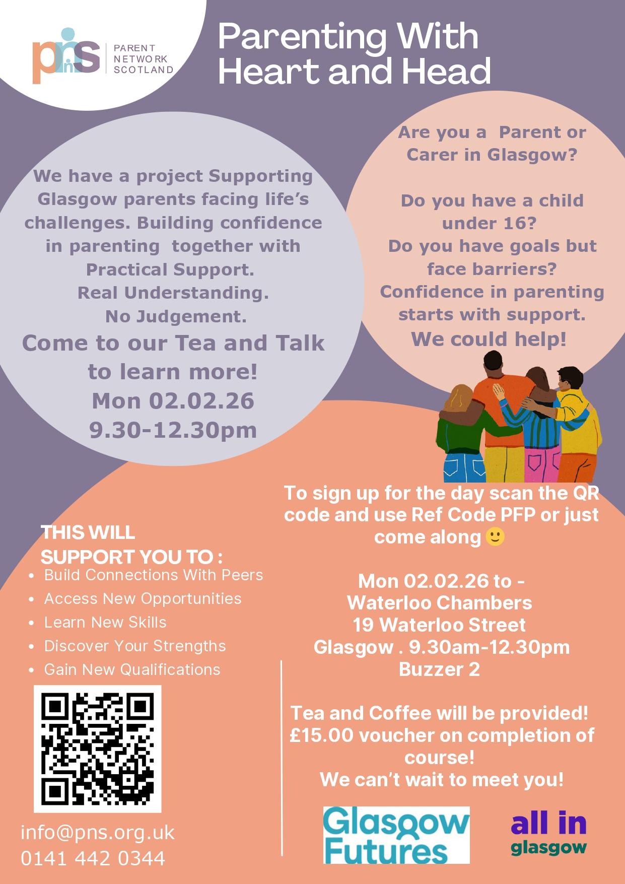 This information session will provide information about the Parenting with Heart and Head project from Parent Network Scotland, supporting Glasgow's parents helping them to parent with confidence through practical support and skills building.
